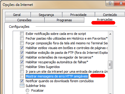 Em computadores com sistema operacional clientes, basta ir no Internet Explorer, menu Ferramentas / Opções / Avançada, desativar a opção "Exibir mensagem de erros personalizadas"
