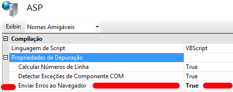 Depois no IIS, em ASP / Propriedades de Depuração / Enviar erros ao navegador, altere a opção para "True"