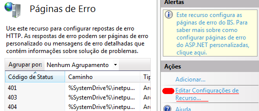 Depois de abrir o IIS ir em ASP / Propriedades de Depuração / Enviar erros ao navegador e alterar a opção para "true". como exibido para computadores clientes, volte ao menu principal do IIS e procure por "Páginas de Erro". Será exibida a lista de página de erros cada uma com as configurações herdadas na instalação. Procure por "Editar Configurações de Recusrsos" na direita desse painel.