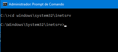 Após isso, com seu CMD aberto, mude para o diretório dos Serviços do IIS em: C:\Windows\System32\inetsrv Levando em consideração que o seu diretório de instalação do Windows foi na pasta C:\Windows caso não seja mude para o diretório do Windows e prossiga.