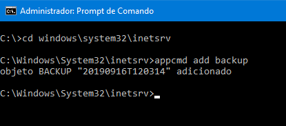 Como mostra a imagem acima, o backup da configuração foi criado com sucesso no sistema. Para saber onde ele está, basta ir na mesma pasta C:\Windows\System32\inetsrv pelo explorer mesmo e abrir a pasta com um cadeado com nome de Backup. Caso você não tenha dado um nome ao seu backup ele vai estar nomeado conforme mostra no prompt de comando em uma pasta.